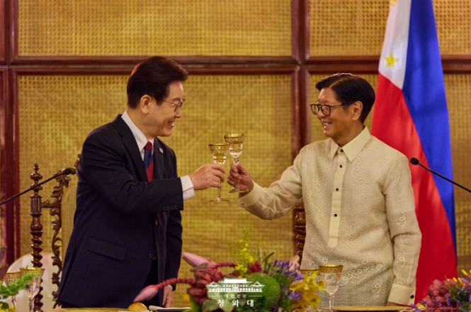 [뉴스서치] 필리핀을 국빈 방문 중인 이재명 대통령 부부는 3일 저녁, 페르디난도 로무알데즈 마르코스 주니어 대통령이 필리핀 말라카냥궁에서 주최한 만찬에 참석했다.