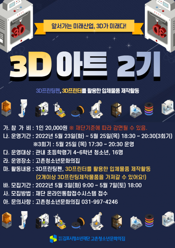 3D아트 2기 프로그램은 5월 23일 ~ 5월 25일 18:30 ~ 20:30 고촌청소년문화의집에서 진행하며 초등학령기 청소년 4~6학년 16명 대상프로그램이다.