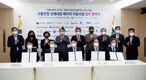 이한규 경기도 행정2부지사, 김영중 고용노동부 고용정책실장, 김종석 양주 시장 권한대행, 정덕채 포천 부시장, 정순욱 동두천시장 권한대행은 27일 경기도청 북부청사에서 ‘고용안정 선제 대응 패키지 지원사업 추진 업무협약’을 체결했다.