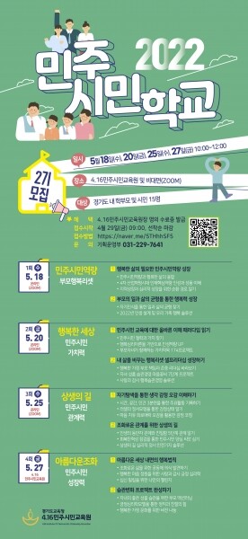 프로그램은 민주시민 역량, 행복한 세상, 상생의 길, 아름다운 조화 등을 주제로 다음 달 18일 20일 25일 27일 모두 4차례에 걸쳐 대면 또는 비대면으로 진행한다.