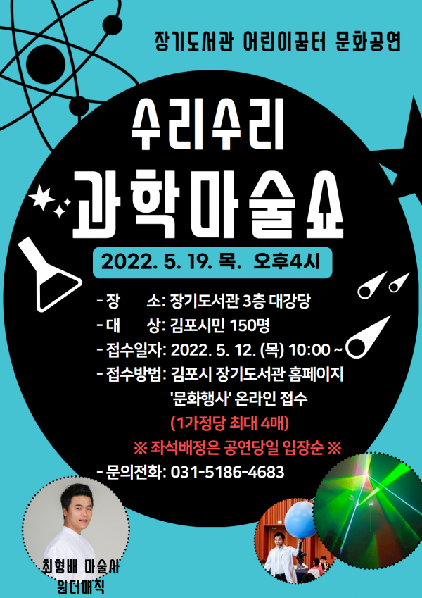 ‘수리수리 과학마술쇼’ 공연은 최형배 마술사와 함께 어려운 과학을 마술과 레이저·그림자쇼를 통해 간단하고 쉽게 과학적 원리를 배우며 공연 후 집에서 해볼 수 있는 재밌는 과학 실험들을 알려준다.