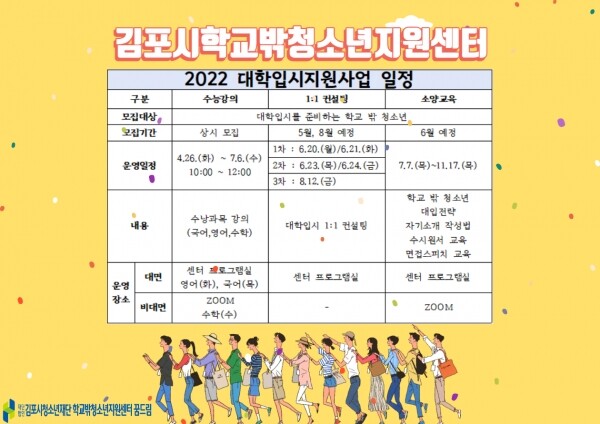 사업은 4월~7월 수능학습지원과 5월~8월 대학입시 1:1컨설팅, 6월~11월 학교밖 청소년 대학입시 지원전략 자기소개서 수시원서 접수 교육 면접스피치교육 등 혼자서 준비하기 어려운 대학입시 준비를 위한 전반적인 지원을 한다.