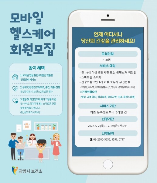 광명시 보건소 관계자는 “모바일 헬스케어 사업을 통해 광명시민의 생활 습관이 개선되고 자가 건강관리 능력이 향상되길 기대한다”며 “언제 어디서나 참여할 수 있으므로 직장인들도 많이 참여해 건강 혜택을 받으시길 바란다”고 말했다.