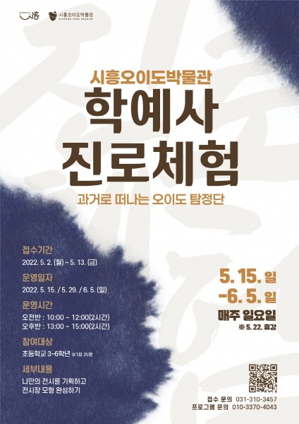 프로그램 세부내용 및 접수와 관련한 자세한 사항은 시흥오이도박물관 누리집의 ‘교육·행사’ 페이지에서 확인할 수 있다한편 교육부 인증 ‘교육기부 진로체험 기관’인 시흥오이도박물관과 문화재청 인증 ‘문화재교육 프로그램’이 운영 중인 오이도 선사유적공원에서는 선사문화체험, 시민전문강사 프로그램, 상설체험 등의 다양한 프로그램들을 운영하고 있다.