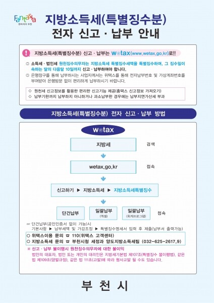 시는 신고·납부 안내문을 제작해 관내 사업장과 세무대리인에게 발송하고 부천시청 홈페이지, 부천세무서 상공회의소 등 각 기관에 안내문을 게시해 전자신고의 중요성을 알릴 계획이라고 전했다.