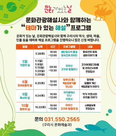 ‘테마가 있는 해설’은 문화가 있는 날, 문화관광해설사와 함께 구리시의 역사, 생태, 마을, 인물 등을 주제로 한 해설 프로그램이다.