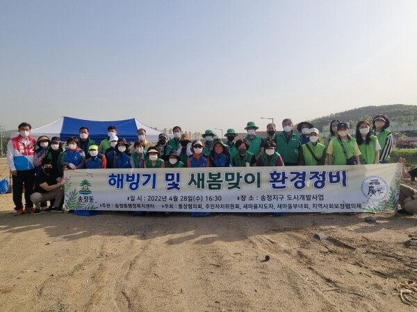 환경정화 활동에는 통장협의회, 주민자치위원회, 새마을지도자협의회, 새마을부녀회, 지역사회보장협의체 등 송정동 내 5개 단체 50여명의 회원들이 참여했으며 참석단체를 5개 조로 나눠 송정동 도시개발지구 소하천을 중심으로 산책길과 도로에 버려진 각종 폐기물을 수거하는 등 겨우내 방치됐던 도시개발지구의 오염원들을 깨끗하게 정비해 쾌적한 환경을 조성했다.