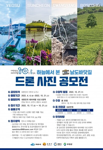 여수시, 순천시, 광양시, 보성군과 문화체육관광부 2022년 지역 연계관광 활성화 사업 6권역 관리사업단에 따르면 지난달부터 오는 10월까지 4개 시군을 촬영 대상으로 ‘하늘에서 본 남도바닷길 드론 사진 공모전’을 개최한다고 밝혔다.