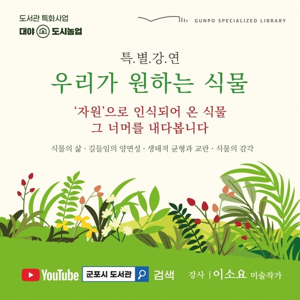 해당 강좌는 대야도서관 도시농업 특별강연으로 ‘군포시도서관’ 유튜브를 통해 누구나 수강할 수 있으며 총 4개의 강좌가 5월 5일부터 5월 26일까지 매주 목요일에 공개된다.