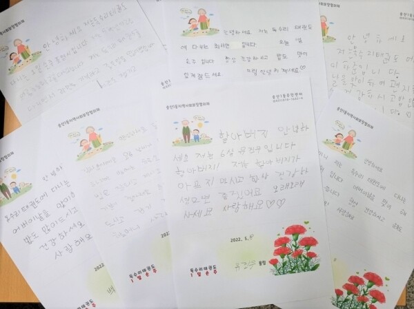 독수리태권도에 다니는 어린이 60여명은 지난 2일 어버이날을 맞이해 홀로 계신 외로운 어르신에게 전달할 감동이 담긴 손편지를 직접 작성해 송산1동 주민센터에 전달했다.