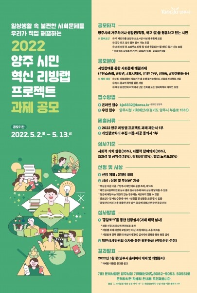 양주시민 혁신 리빙랩 프로젝트는 탄소중립, 청년, 도시재생, 1인가구, 아동, 양성평등 등 분야별 생활문제를 지역주민들의 새롭고 참신한 아이디어를 바탕으로 직접 실험해보며 사회적 가치를 실현하기 위한 프로젝트로 올해로 4회째를 맞았다.