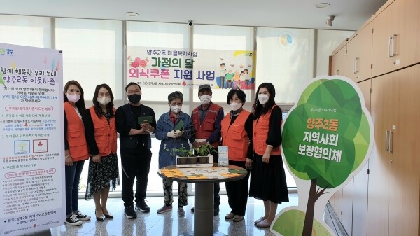 이날 협의체는 관내 저소득 조손·다문화·한부모 다자녀, 긴급생계 가정 등 30가구에 양주2동 이웃사촌가게 음식점 9개소에서 5월 한 달간 이용 가능한 5만원 상당의 외식쿠폰을 지급했다.