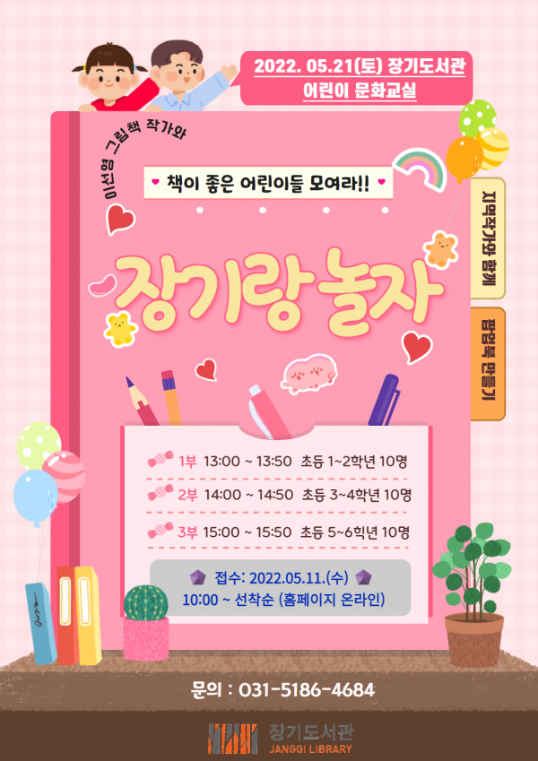 이번 프로그램은 5월 가정의 달을 맞이해 지역작가 이선영 그림책 작가와 함께 자기 객관화와 감정테라피를 주제로 한 팝업북 만들기 활동으로 장기도서관 1층 어린이문화교실에서 대면 수업으로 진행한다.