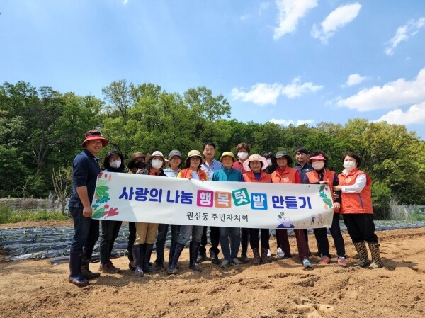 이날 주민자치회 위원 및 원신동장 등 20여명은 밭을 갈고 비닐을 씌운 후 고구마 모종을 심었으며 9월 수확해 관내 저소득계층에게 기부할 예정이다.