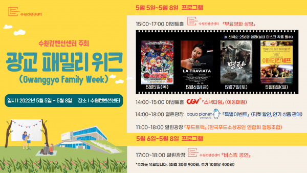 수원컨벤션센터 관계자는 “이번 광교 패밀리 위크가 코로나19 시기를 지나온 시민들이 소통하고 즐길 수 있는 시간이 되길 바란다”며 “수원컨벤션센터를 전시·컨벤션 행사를 개최하는 경기 남부권의 MICE 중심지이자 시민들과 함께하는 따뜻한 공간으로 만들겠다”고 밝혔다.