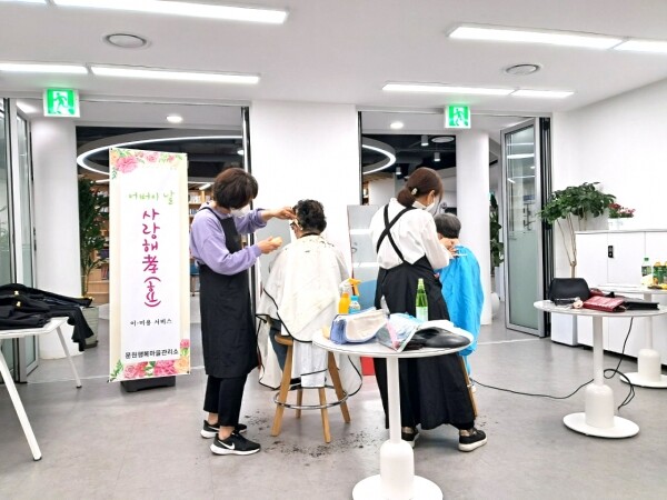 문원행복마을관리소 내 문원사랑방에서 진행된 이날 봉사에는 미용봉사자 2명을 비롯 10여명의 봉사자가 참여했다.