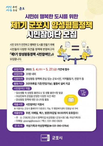 군포시는 시민 모두가 안전하고 행복한 양성평등도시 조성을 목적으로 시민들의 다양한 의견을 정책에 반영하기 위한 ‘제1기 군포시 양성평등정책 시민참여단’을 모집한다고 밝혔다.