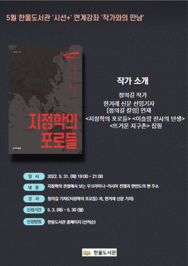 이번 강연은 ‘지정학의 포로들’의 저자이자 한겨레 신문 국제부 기자인 정의길 기자가 ‘지정학의 관점에서 보는 러시아, 우크라-러시아 전쟁의 전후, 나토 확장, 자유주의 국제질서의 기로’라는 주제들로 이야기를 전할 예정이다.