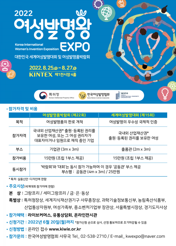 특허청이 주최하고 한국여성발명협회가 주관하는 ‘2022 여성발명왕엑스포’는 특허·실용실안·디자인을 출원했거나 등록받은 만 17세 이상의 여성이라면 누구나 행사 누리집을 통해 신청할 수 있다.