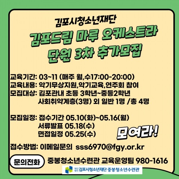 김포드림마루 오케스트라는 2013년에 자립 거점기관으로 선정되어 올해로10년째 운영하고 있으며 음악을 통해 청소년의 건강한 성장을 지원하며 청소년의 문화예술 감수성 향상을 위한 프로그램이다.