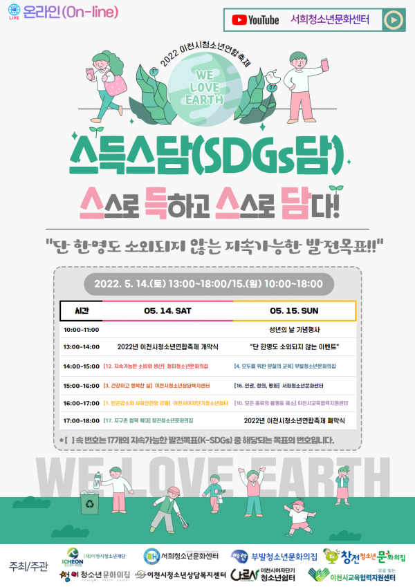 본 축제는 5월 14일 15일 양일간 개최되며 유튜브에서 ‘서희청소년문화센터’를 검색해 실시간으로 참여가 가능하다.