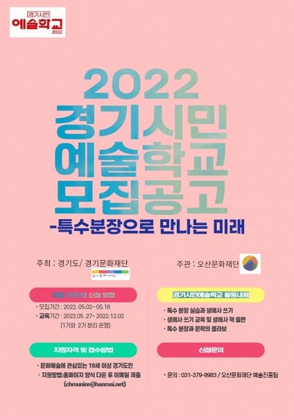 한편 경기시민예술학교 오산캠퍼스 프로그램 참여 신청은 5월 18일까지 오산문화재단 홈페이지에서 신청서를 다운받아 해당 메일로 접수하면 된다.