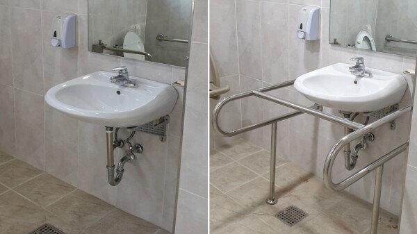 화장실 이용 편의를 위해 자동문 버튼의 높이를 낮추고 세면대에 보조 손잡이와 비상시 이용 가능한 도움벨을 추가 장착했다.