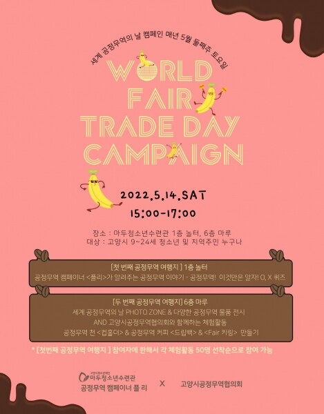 올해 마두청소년수련관에서 개최되는 본 행사는 고양시 공정무역 Story Map제작 및 다양한 캠페인을 기획·운영하는 공정무역 청소년 활동가 ‘Pli’ MZ세대와 2020년에 창립해 공정무역 활동가 양성, 공정무역 홍보캠페인 등 여러 활동을 이어오고 있는 기성세대인 ‘고양시공정무역협의회’가 함께 연대해 개최된다는 점에 있어서 의미 있는 행사이며 특히 올 해부터 고양시 청소년시민들과의 지속적인 협업을 위해 업무협약식도 진행된다.