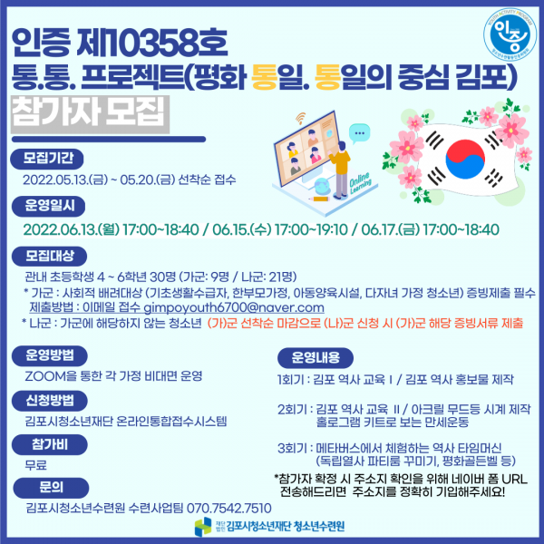 인증 제10358호 ‘통.통. 프로젝트’는 관내 초등학생 4~6학년 청소년을 대상으로 앱을 활용한 김포 역사 홍보물 만들기, 애국 상징물 아크릴 무드등 시계 제작, 홀로그램 영상 감상, 메타버스로 체험하는 역사 타임머신 등 디지털 기술을 활용한 역사·평화통일 체험이 총 3회기로 6월 13일 15일 17일진행될 예정이다.