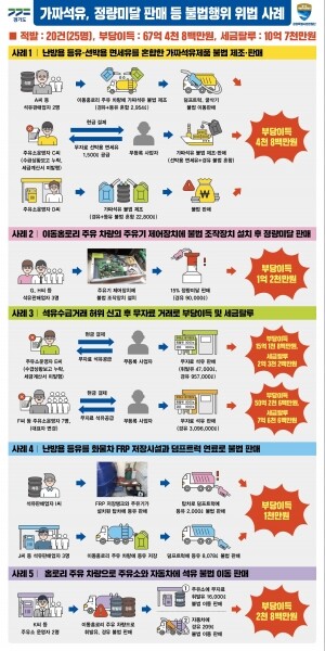 이밖에 석유판매업자인 주유업자 I씨와 J씨, K씨 등 7명은 주유소를 운영하면서 평택, 오산, 여주, 포천 건설현장과 화물자동차에 홈로리 차량을 이용해 등유와 경유, 휘발유 등 석유제품 2만5,237리터를 불법 이동 판매해 3,700만원의 부당이득을 취했다.
