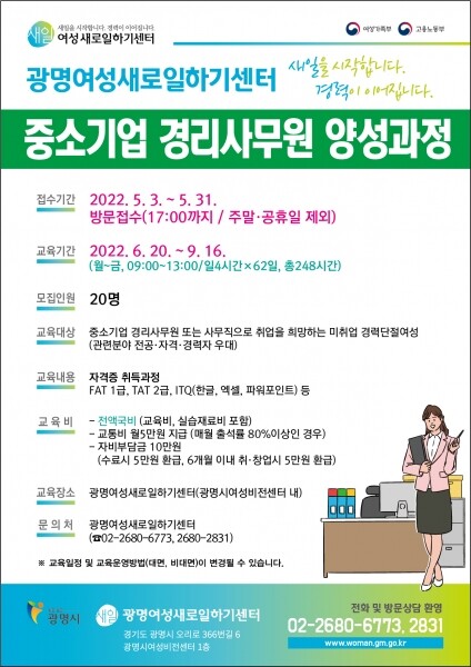 모집인원은 20명이며 광명시 여성비전센터 1층 취업상담실로 방문 신청하면 된다.