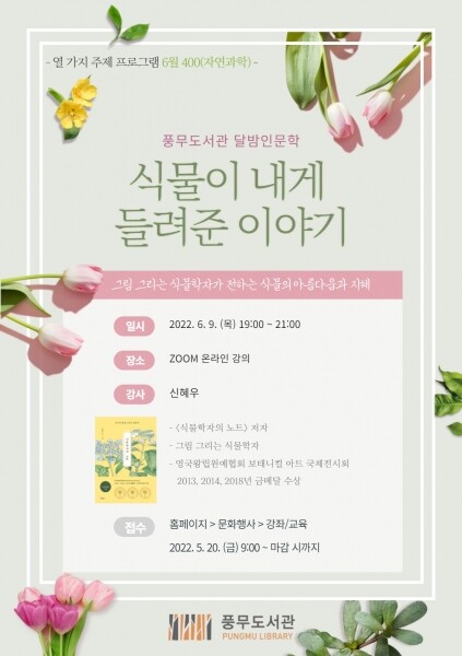 강의 신청은 5월 20일 금요일 오전 9시부터 풍무도서관 홈페이지에서 온라인으로 이루어지며 선착순 50명을 모집한다.