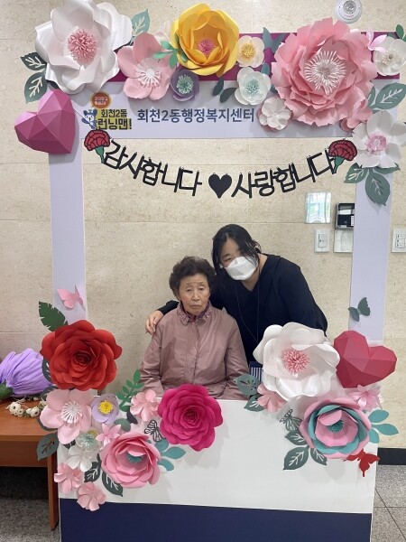회천2동은 복합청사 내 1층 주민사랑방 옆에 대형 카네이션과 데코픽, 화관 등 다양한 소품을 비치해 주민들이 자유롭고 즐겁게 사진을 찍을 수 있도록 포토존을 조성했다.