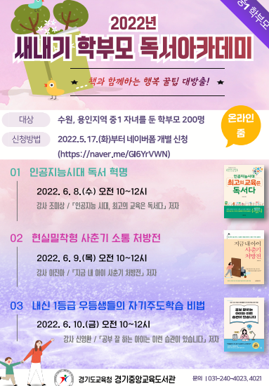 중학생 학부모 대상 강연은 다음 달 8일부터 10일까지 인공지능시대 독서 혁명, 현실 밀착형 사춘기 소통 처방전, 자기주도학습 비법 등을 주제로 온라인으로 운영한다.
