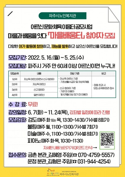 마을배움터 참여자는 파주시노인복지관과 협약을 맺은 민간 문화·체육시설 4곳에서 6월부터 11월까지 검도, 볼링, 미술, 피아노 강좌를 무료로 수강할 수 있다.