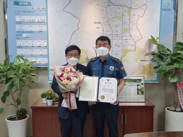 이번 감사장 수상은 최근 태전파출소 시야를 가리고 있던 나무를 정리하는 작업에 이상오 동장의 협조에 감사한 마음으로 홍남순 태전파출소장의 추천으로 이뤄졌다.