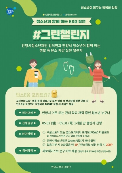 재단은 챌린지 기획 및 운영을 위해 사회공헌 모바일 플랫폼인 포아브와 업무협약을 체결한 가운데, 오는 21일 개최 예정인 2022 안양시 청소년축제 당일‘Green 챌린지’홍보 부스를 운영할 예정이며 리워드는 6월부터 각 권역별로 소재한 가까운 수련관 및 문화의집에서 현장 수령할 수 있다.