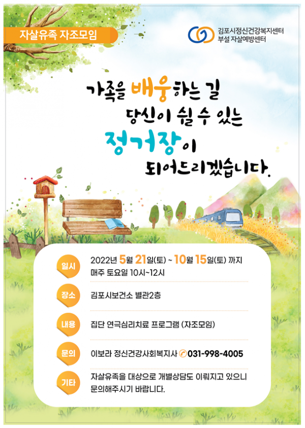 자살유족 자조모임 ‘정거장’은 5월 21일부터 매주 토요일 오전 10시~12시에 김포시보건소 별관2층 정신건강복지센터 부설자살예방센터에서 총 20회기로 진행되며 연극심리상담 치료 프로그램을 통해 자살 유족의 건강한 애도과정을 돕는다.