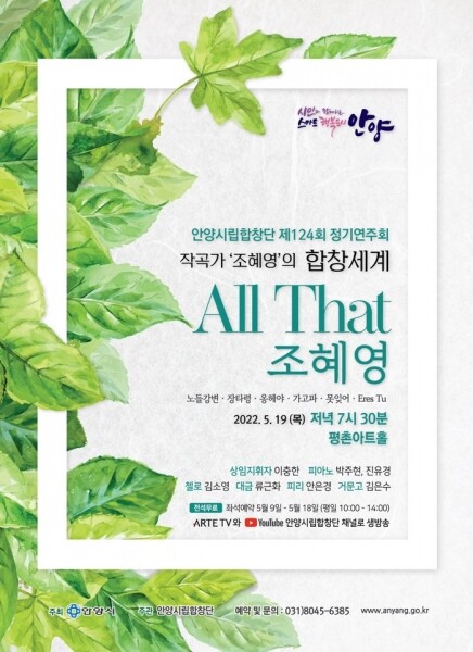 안양시립합창단은 이날 정기연주회에서 이충한 상임지휘자의 지휘로 조혜영이 작곡한‘봄날’과‘새노야’,‘금잔디’,‘나비에게’,‘꿈’,‘가고파’,‘못잊어’등 주옥같은 16곡들을 100분 동안에 걸쳐 선사한다.
