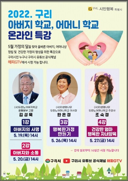 [뉴스써치] 구리시는 가정의 달을 맞아 오는 5월 19일부터 27일까지 총 4회에 걸쳐 구리시 유튜브 공식채널인 해피GTV를 통해 ‘구리아버지학교, 어머니학교’ 온라인 특강을 운영한다.