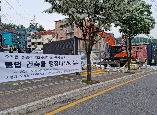 이번에 실시한 행정대집행은 2019년 2월부터 오포읍은 건축법 위반에 따른 시정 명령, 이행강제금 3회 부과, 고발 등 지속적인 행정처분에도 불구, 2020년 불법 건축물을 추가로 축조하고 임차행위를 계속하는 등 행정기관의 처분에 불응했다.