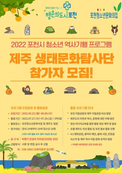 시 관계자는 “관내 청소년들이 쉽게 접하기 힘들었던 제주도 생태문화탐방을 통해 과거와 현재의 관계성과 지식 함양 등 미래를 바라볼 수 있는 지혜를 얻게 될 것이다”며 “앞으로도 포천시 청소년들이 다양한 체험활동을 통해 건강하게 성장할 수 있도록 적극적으로 지원하겠다”고 말했다.