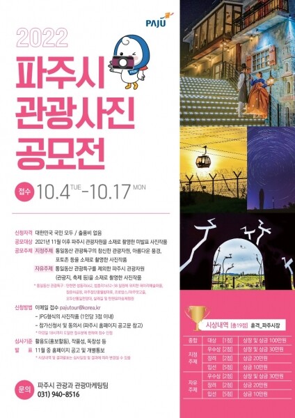 접수기간은 10월 4일부터 10월 17일까지로 신청자는 파주시 홈페이지 고시·공고에 게시된 참가신청서와 동의서를 작성해 JPG형식의 사진작품과 함께 이메일로 신청하면 된다.