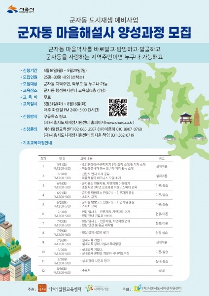 양성과정 모집 인원은 25명에서 30명 내외로 군자동에 관심이 있는 지역주민이면 누구나 지원할 수 있다.