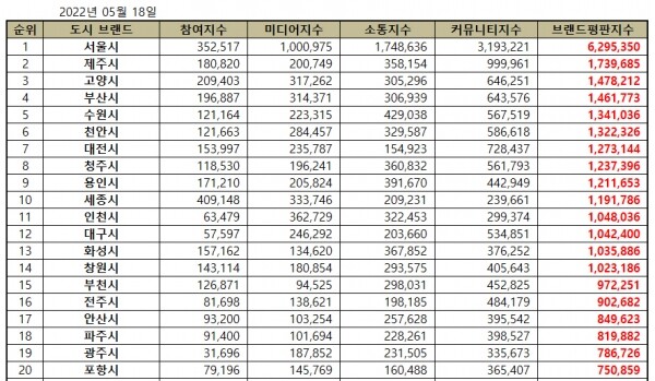 대한민국 도시브랜드평판 조사 결과에 따르면 고양시는 참여지수 209,403 미디어지수 317,262 소통지수 305,296 커뮤니티지수 646,251이 되면서 브랜드평판지수 1,478,212로 분석됐다.