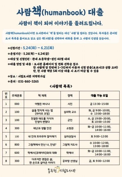 이를 위해 동두천시립도서관에서는 8명의 사람책을 준비했으며 8명의 사람책 주제는 어쨌든 바나나 삶을 멋지게 사는법 친절한 태도를 가지자 인생이 변했다 재난과 생활안전 내 안의 트라우마 알아채기 그림책에서 만난 나, 안녕? 학예사와의 대화 다르지만 괜찮은 삶, 한 손으로 살아온 이야기 등이 있다.