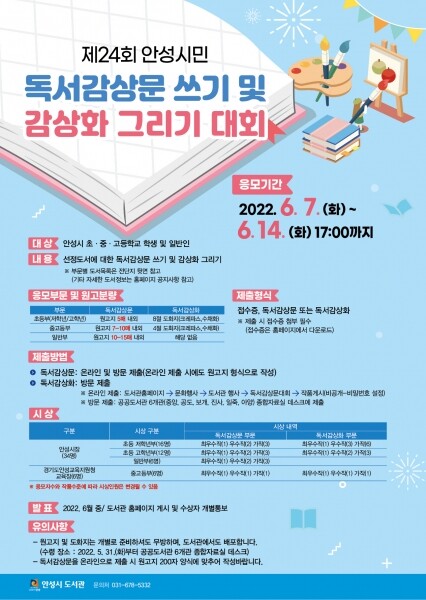 접수장소는 안성시 공공도서관 6개관 종합자료실이며 독서감상문은 도서관 홈페이지에서 온라인으로도 접수 가능하다.