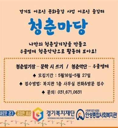신청대상은 60세 이상 안성시민으로 참여 신청은 전화접수와 방문접수 모두 가능하며 자세한 내용은 안성종합사회복지관 홈페이지를 통해 확인할 수 있다.