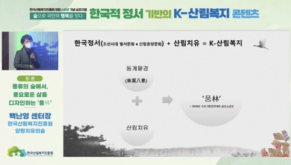 이번 행사에 앞서 개최된 한국산림복지진흥원 창립 6주년 심포지엄과 한-미 온라인 세미나에서 ‘한국적 정서와 K-산림복지’ 주제의 우수사례를 발표하며 옛 선비의 ‘자연속 풍류’ 문화를 연계한 한국 고유의 산림치유 콘텐츠를 선보였다.