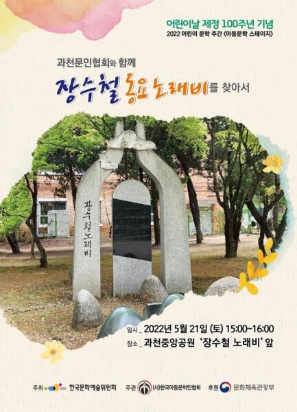19일 과천시에 따르면, 오는 21일 오후 3시 중앙공원 ‘장수철 노래비’ 앞에서 관내 초등학교 어린이들의 동시 낭송, 시민과 함께 동요 부르기, 어린이 즉석 사진 촬영 등이 진행되는 기념행사가 열린다.